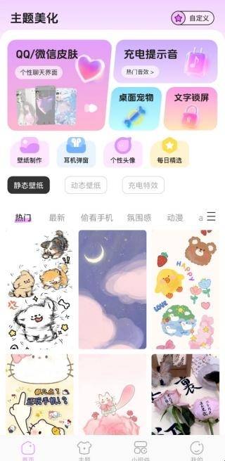 主题壁纸组件大全是一款功能十分全面的自定义美化软件,在该软件里面具有海量的精美壁纸以及主题,还可以自由更换聊天皮肤充电提示音等等,还可以设置各种各样的小组件以及桌面宠物等等,还有很多丰富小组件,还在等什么呢,感兴趣的朋友一起来下载吧!