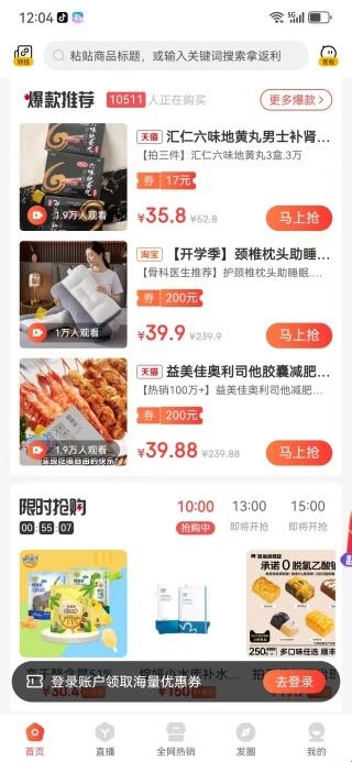 1、限时抢,新增限时抢板块,购物得大额返利,淘宝/天猫商品限量0元抢,各种好物限时抢购,抢到就是赚到