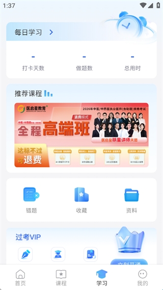 4、每天的学习情况都会自动统计出来,让你了解自己的学习进度与做题数量,能够进行错题巩固练习,还会推荐课程。