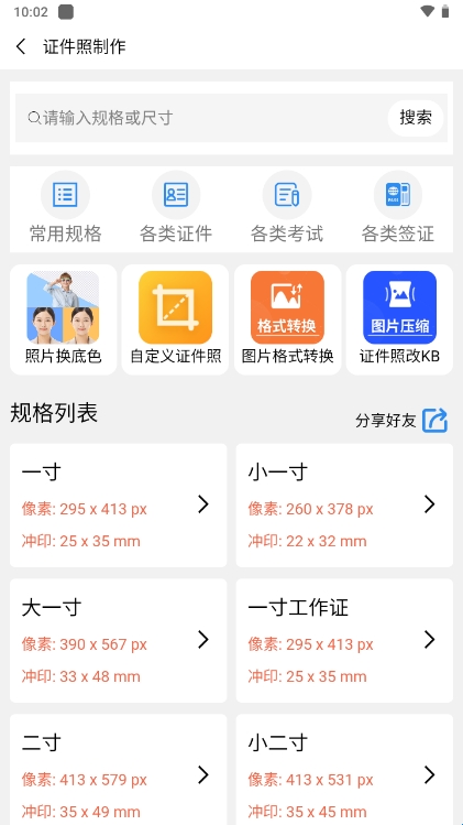 3、在证件照制作页面选择尺寸,然后按提示进行快速的制作即可;
