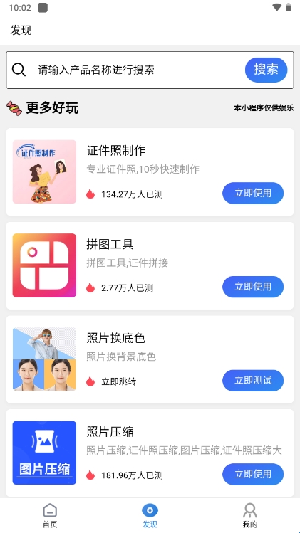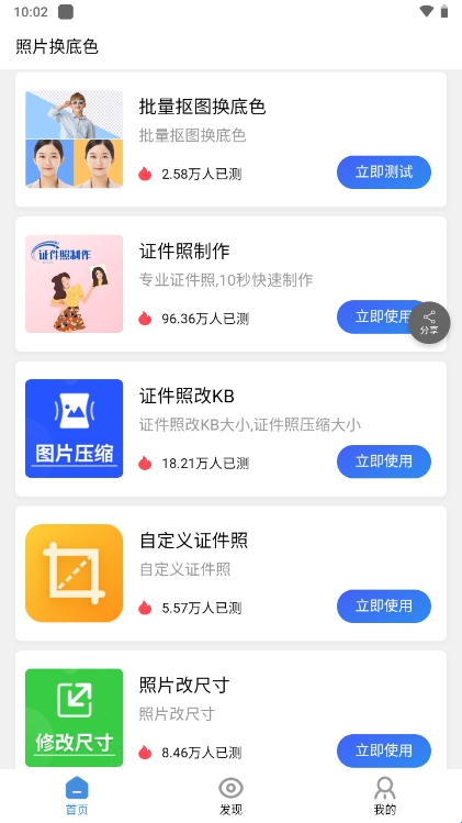 4、在发现页面提供了证件照制作、拼图工具、照片换底色、照片压缩等功能。