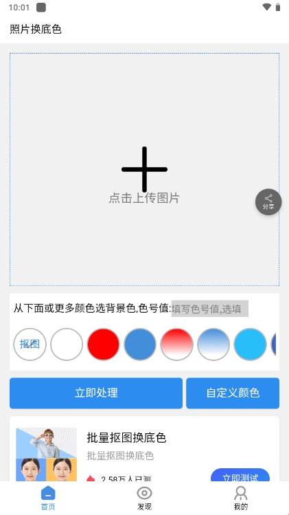 1、在首页中可以添加你的证件照图片,然后选择更换的颜色,点击立即处理即可;