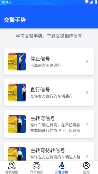 3、交警手势学习,让用户学习不同交警手势的含义,了解指挥的信号。