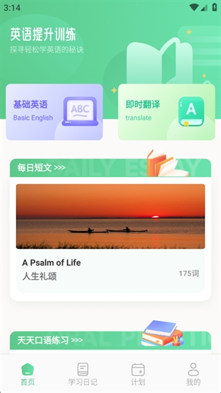 1、打开app就能看到很多的英语学习功能,帮助大家打好基础,还能进行翻译;