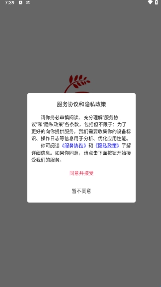 1、打开软件,新用户会显示服务协议页面,点击下方同意并继续。
