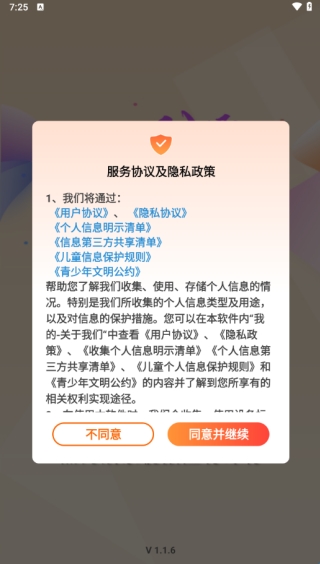 1、打开软件阅读服务协议和隐私政策,点击同意并继续即可进入登录页面。
