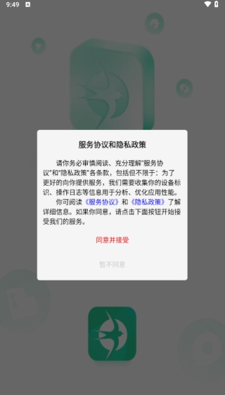 1、打开软件阅读服务协议和隐私政策,点击同意并接受即可进入首页。