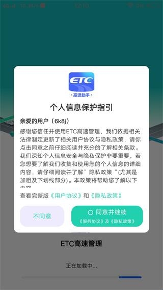 1、在手机应用市场轻松下载安装ETC畅行通达app,查看个人信息保护指引,点击同意并继续。