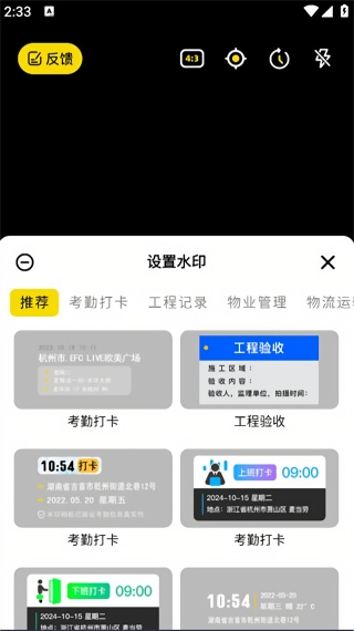 4、选择水印模板打开app,从预设的丰富水印模板中挑选适合的场景的样式,如工作日志、外勤签到或旅行记忆等。