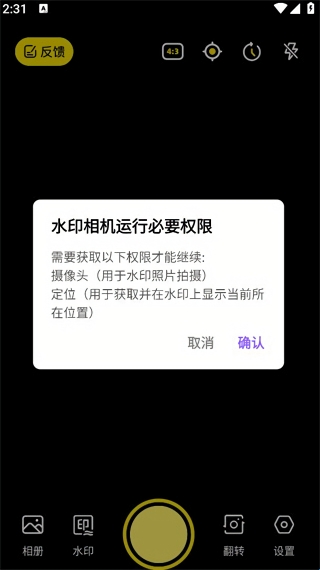 2、在这里水印相机的运行需要获取摄像头、和定位权限,点击确认即可完成设置。