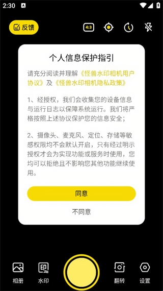 1、首先,在自己的智能手机上下载并安装怪兽水印相机app,阅读个人信息保护指引后点击同意。