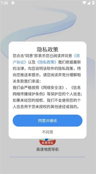 1、下载安装高速地图导航app,查阅隐私政策后点击同意并继续下一步。