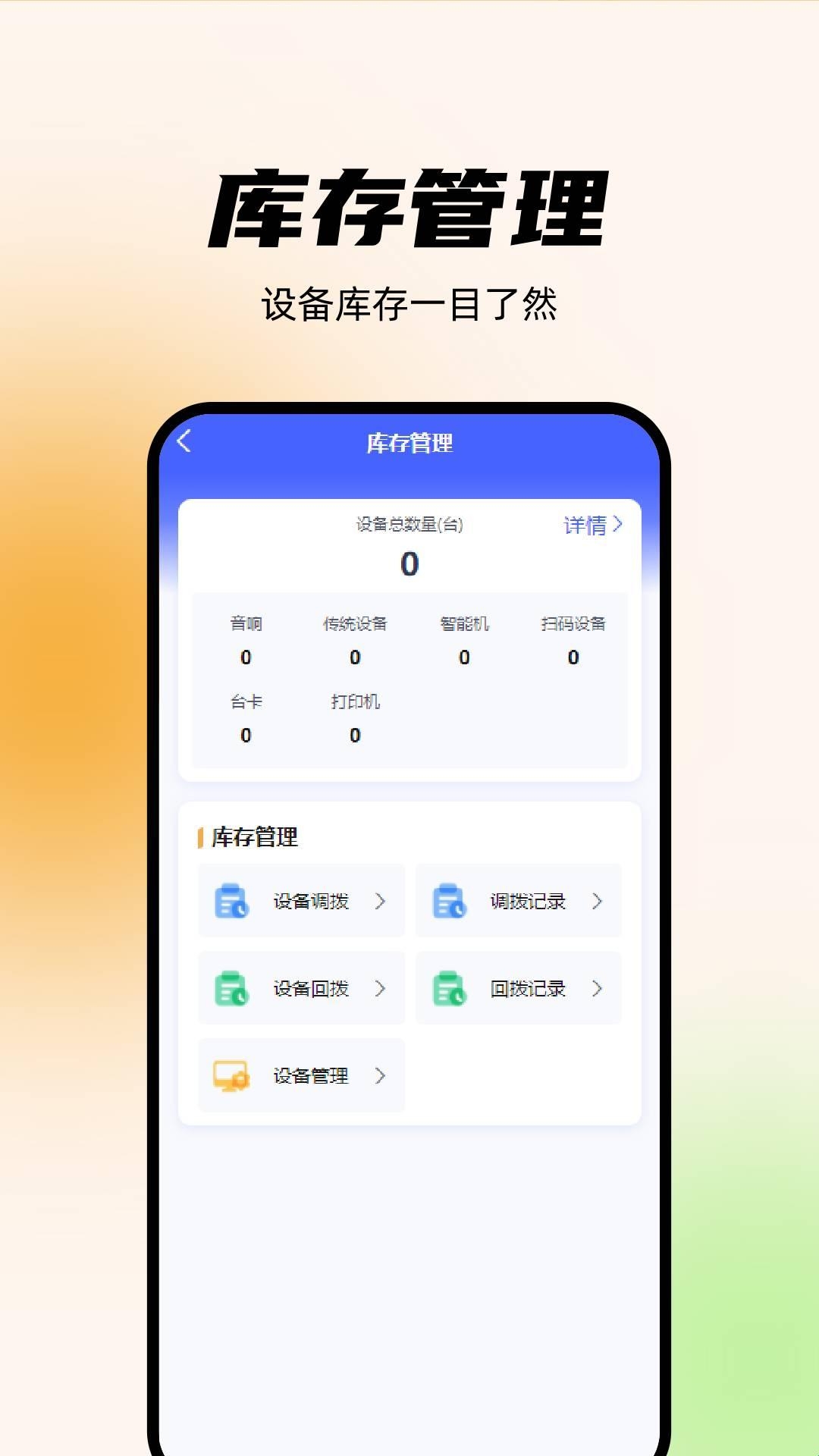 4、库存管理:通过软件就能实现设备库存管理,知道各个设备数量,以便能高效调拨和回拨等操作;