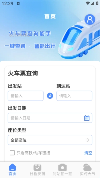2、进入首页可以看到丰富的功能,输入时间地点即可查询火车票。