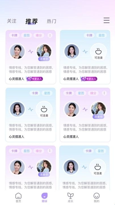 1、通过星座运势、情感连麦等娱乐化功能,降低用户接触心理服务的门槛,让心理疏导变得“有趣不尴尬”,吸引用户轻松参与。