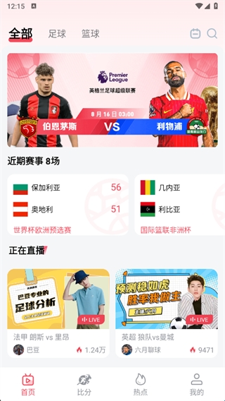 2、首页提供了实时的近期赛事比分情况,让大家能够实时的了解。