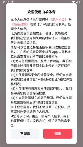 1、下载山羊体育最新版,安装好打开会看到提示弹窗,点击同意。