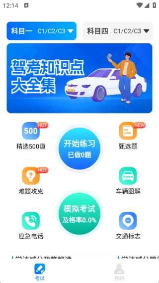 1、在考试页面的科目一页面,有开始练习、精选500题、模拟考试、难题攻克、车辆图解及交通标志等版块。
