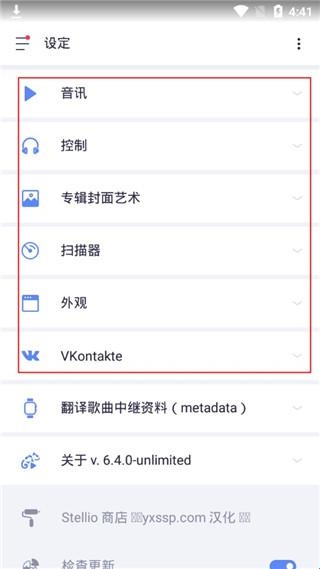 4、在“设定”中可以对:音讯、控制、专辑封面艺术、扫描器、外观等进行设置。