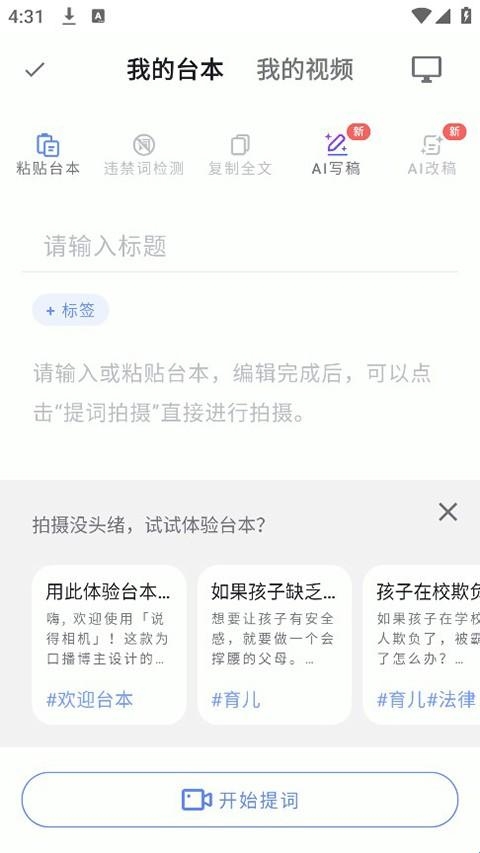 3、新建台本后,用户需要输入视频所需要的台本内容以及自己定义标题。