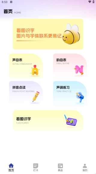 1、在本站下载完成后,打开软件进入到首页,提供声母表、韵母表、拼音点读、声调练习等服务。