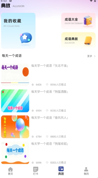 3、点击典故栏目,提供我的收藏、成语大全、成语典故,还能学习每天一个成语。