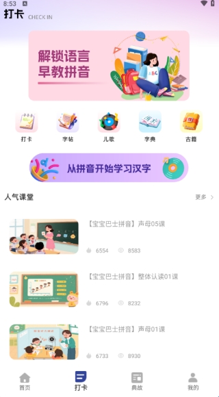 2、点击打卡栏目,提供字帖、儿歌、字典、古籍等服务。