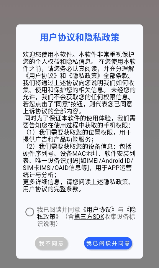 1、首先打开软件阅读隐私政策和协议后,点击“我已阅读并同意”按钮进入APP