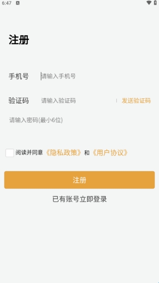 4、来到软件注册页面输入手机号、填写验证码、点击注册即可完成。