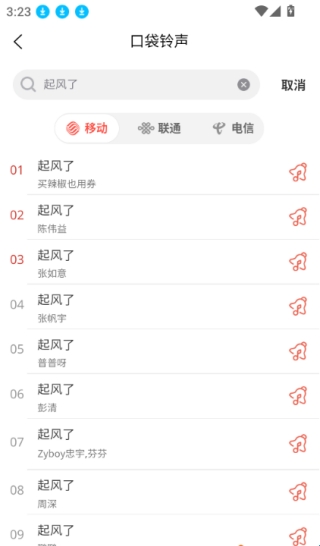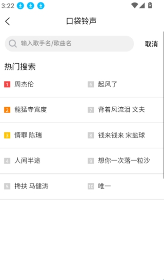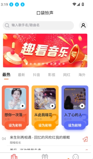 2、来到软件口袋铃声页面,可播放热门铃声,也可搜索自己喜欢的歌曲名称。