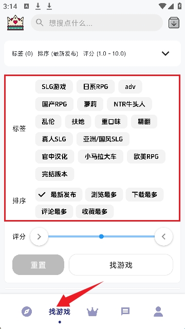 4、然后来到【找游戏】专区中,如图所示,这里有各种有趣的标签,而且顶部提供了搜索框。大家可以通过标签进行查询自己喜欢的游戏。
