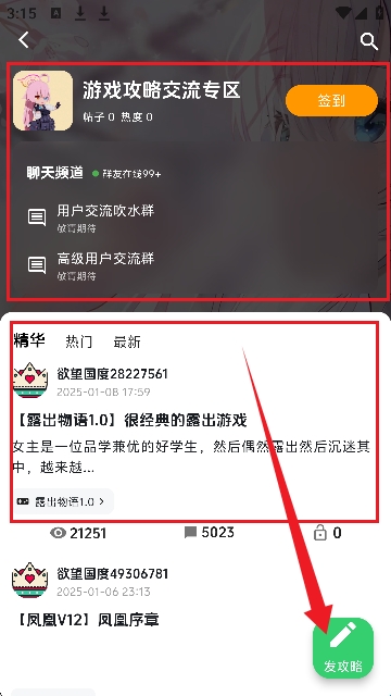 5、然后在【游戏攻略交流专区】大家可以查找对自己有帮助的攻略文章。当然你对游戏有自己的独到的见解也可以在这里发表攻略文章哦。