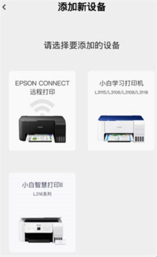 2、点击【暂无设备,前往绑定】,选择要添加的设备,目前仅支持EPSON、小白学习打印机、小白智慧打印II。