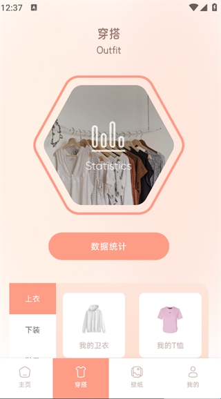 3、点击页面下方的‘穿搭’,即可看到数据统计、根据分类查看穿搭物品等功能;