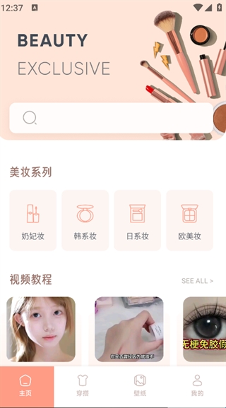 2、在主页面即可看到美妆系列、视频教程等功能;