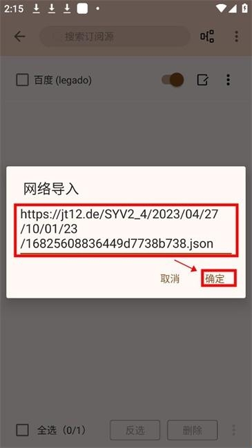 4、将书源粘贴到弹出的【网络导入】里,点击【确定】
