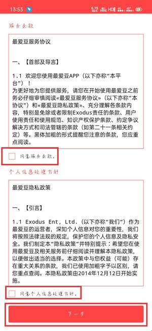 1、先开启从本站下载而来的韩爱豆APP ,开启该应用后,首要步骤是研读并确认服务条款,在【同意……】处打勾,随后点击【下一步】;