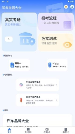 1、在首页带来了题目练习、考试要点、选车等多个板块,让驾考服务更贴心。