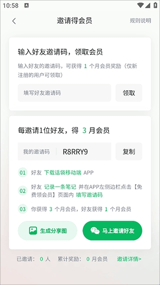 老用户通过「我的」→「邀请得会员」→「马上邀请」生成唯━邀请码&宣发海报&文案
