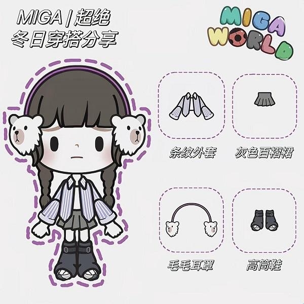 3、条纹外套+灰色百褶裙+毛毛耳罩+高筒鞋。