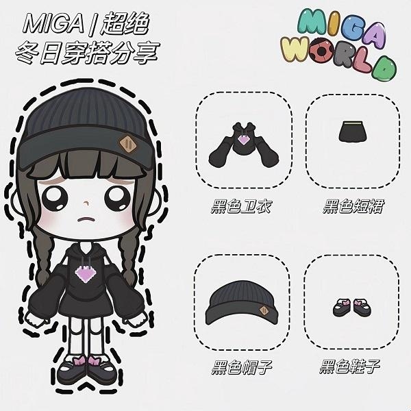 2、黑色卫衣+黑色短裙+黑色帽子+黑色鞋子。