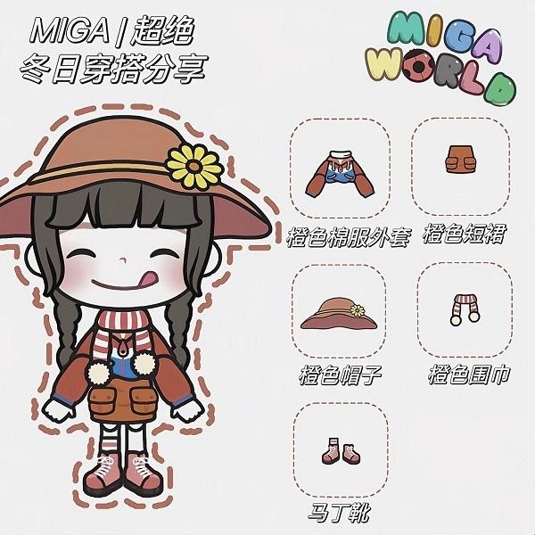 7、橙色棉服外套+橙色短裙+橙色帽子+橙色围巾+马丁靴。
