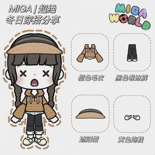 6、橙色毛衣+黑色卷边库+遮阳帽+黄色拖鞋。