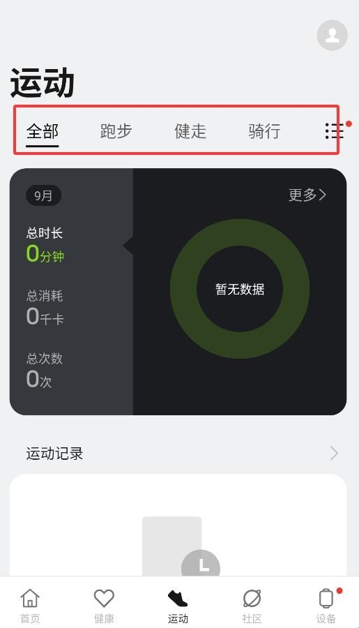 4、运动界面记录跑步、健走等运动时长、消耗及次数,并支持历史数据查询。