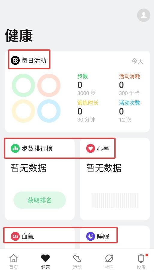 3、健康板块可查看每日活动数据、心率血氧指标及睡眠质量分析报告。