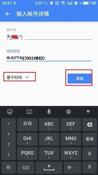 4、我们再回到身份验证器,点击开始按钮,设置身份验证器。输入你在那个应用里的账号名,以及刚才拷贝下来的那串字符,选择按照时间来生成。然后点击添加按钮,身份验证器就会开始配置对应的动态密码。