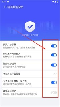 5、在网页智能保护页面开启网页广告屏蔽等功能