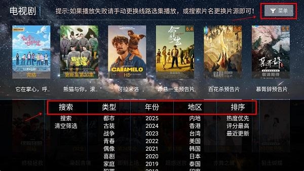 3、点击进入具体的分类影视后,可以点击右上角菜单,会在下方展示筛选条件,方便找剧
