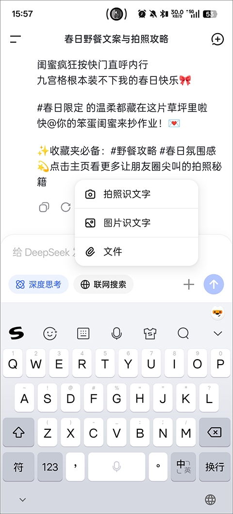 2、发送键还可以附加图片/文档来对DeepSeek进行提问。
