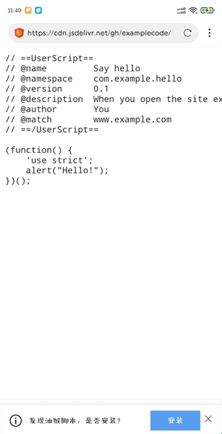 最直接的方式,你只需要在网梭浏览器中打开脚本的URL,浏览器检测出是油猴脚本会自动提示您安装,如下图所示。